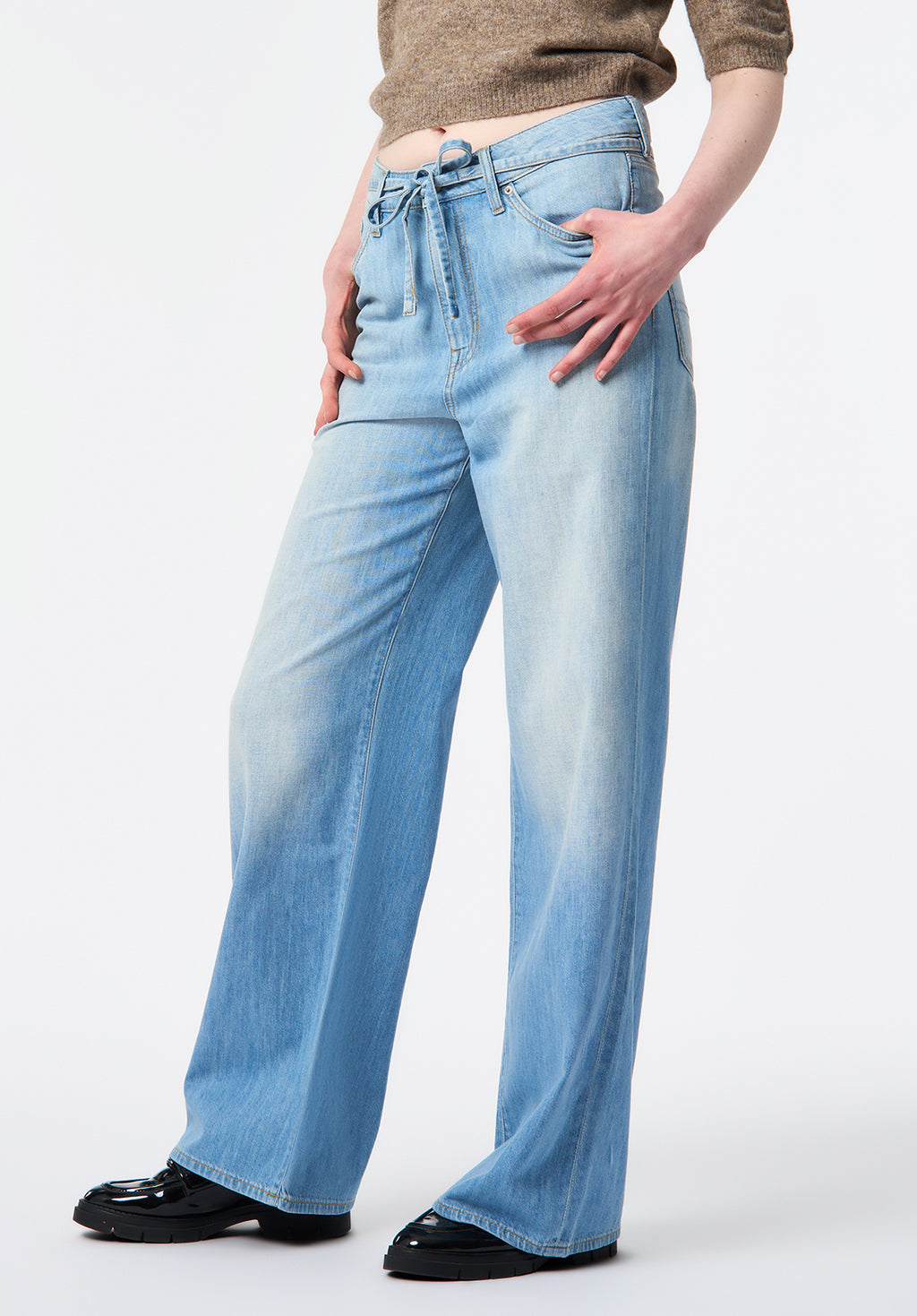 Upgrade your everyday denim with the Alecia women's high rise wide leg jeans in a light and worn wash. Featuring a relaxed fit, soft fade detailing, and a self-tie belt, these jeans offer both structure and laid-back style. Perfect for pairing with cropped knits or tucked-in tees for a clean, effortless look.