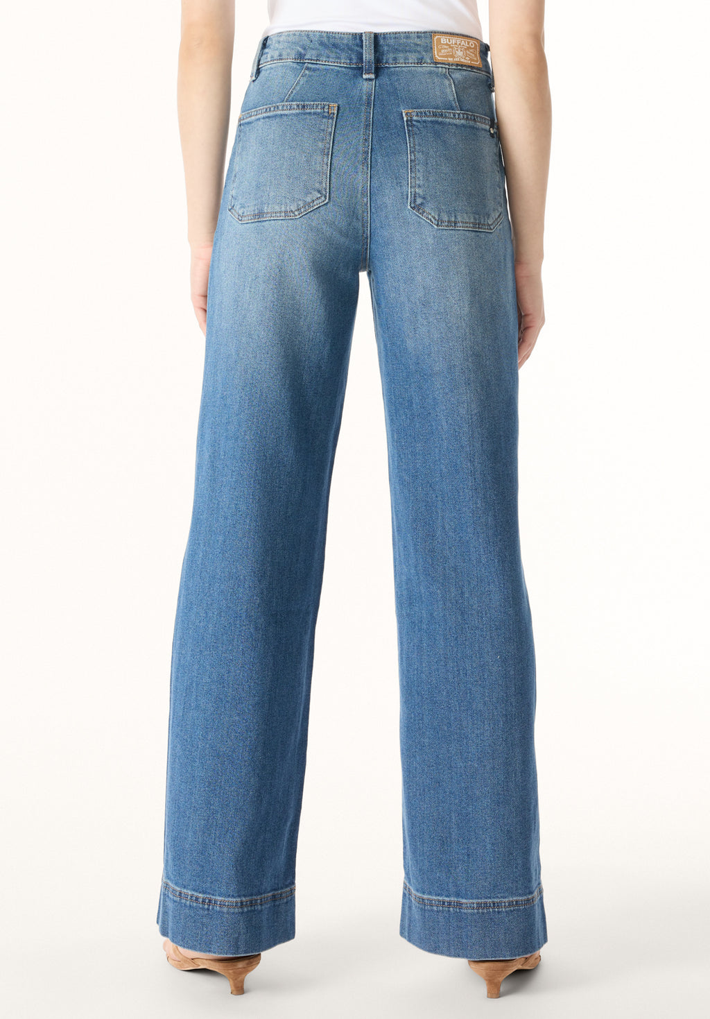 Make a bold statement with these high-rise wide-leg jeans. Designed for both comfort and style, these jeans feature a structured wide-leg fit that creates a relaxed yet polished silhouette. The medium wash denim and large front pockets add a touch of utility-inspired charm, while the high-rise waist flatters your figure. Perfect for dressing up or down, these jeans are a versatile addition to your wardrobe.