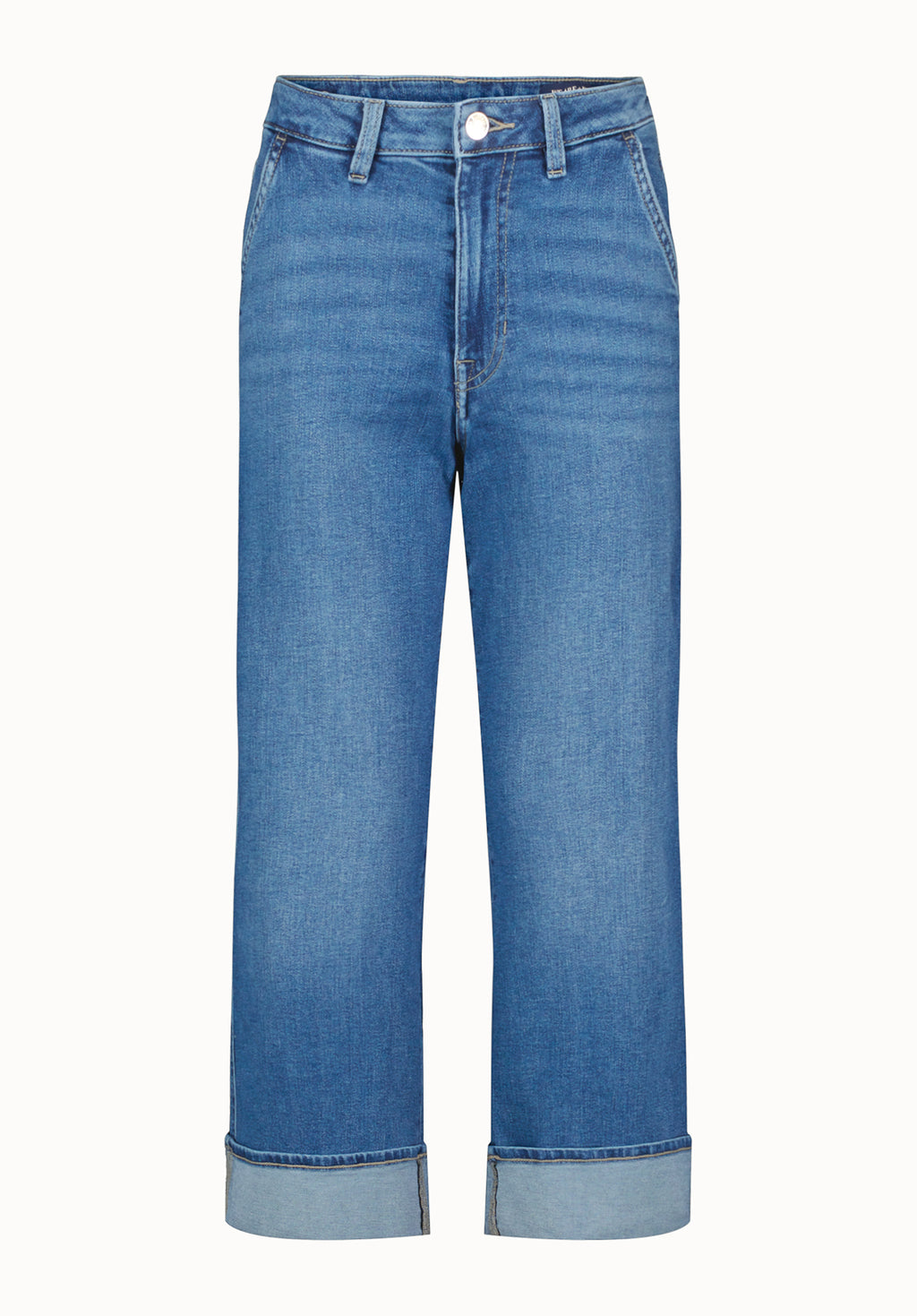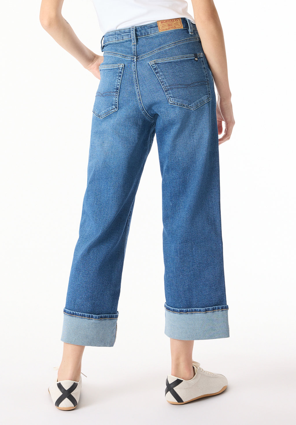 Embrace effortless style with these wide-leg cropped Addisson jeans, featuring a bold cuffed hem for a contemporary edge. Designed in a classic mid-wash, these jeans include a high-rise waist and a relaxed fit that flatters all body types. The versatile design is complete with functional pockets, belt loops, and a durable button-fly closure. Perfect for dressing up with heels or keeping it casual with sneakers, these jeans are a staple piece for year-round wear.