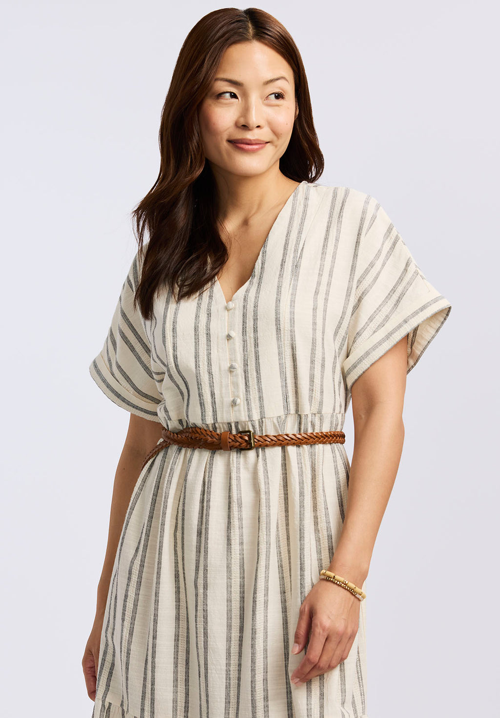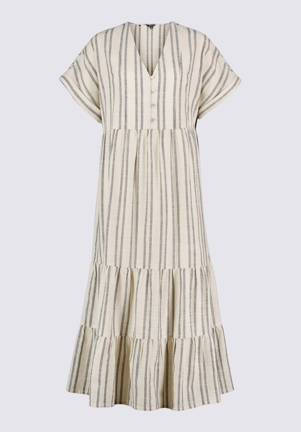 Stay breezy and beautiful in the Aurinda women's midi dress. Crafted from soft textured cotton with classic vertical stripes, this dress features a tiered silhouette and relaxed fit for effortless movement. Perfect for warm weather, vacations, and everyday casual style, it brings comfort and timeless charm to your wardrobe.