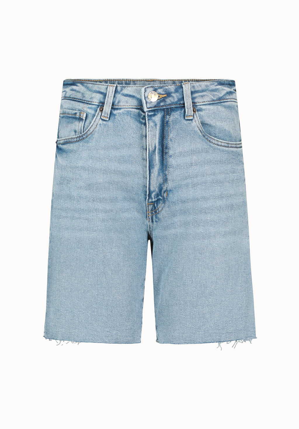 Stay stylish and comfortable with these high-rise frayed hem Bermuda shorts. Crafted from soft, durable denim, these shorts feature a light blue wash and a knee-length cut for a modern and relaxed vibe. The raw, frayed hem adds a touch of edge to their classic design, while the 5-pocket styling ensures functionality. These Bermudas are perfect for laid-back summer days or casual outings.