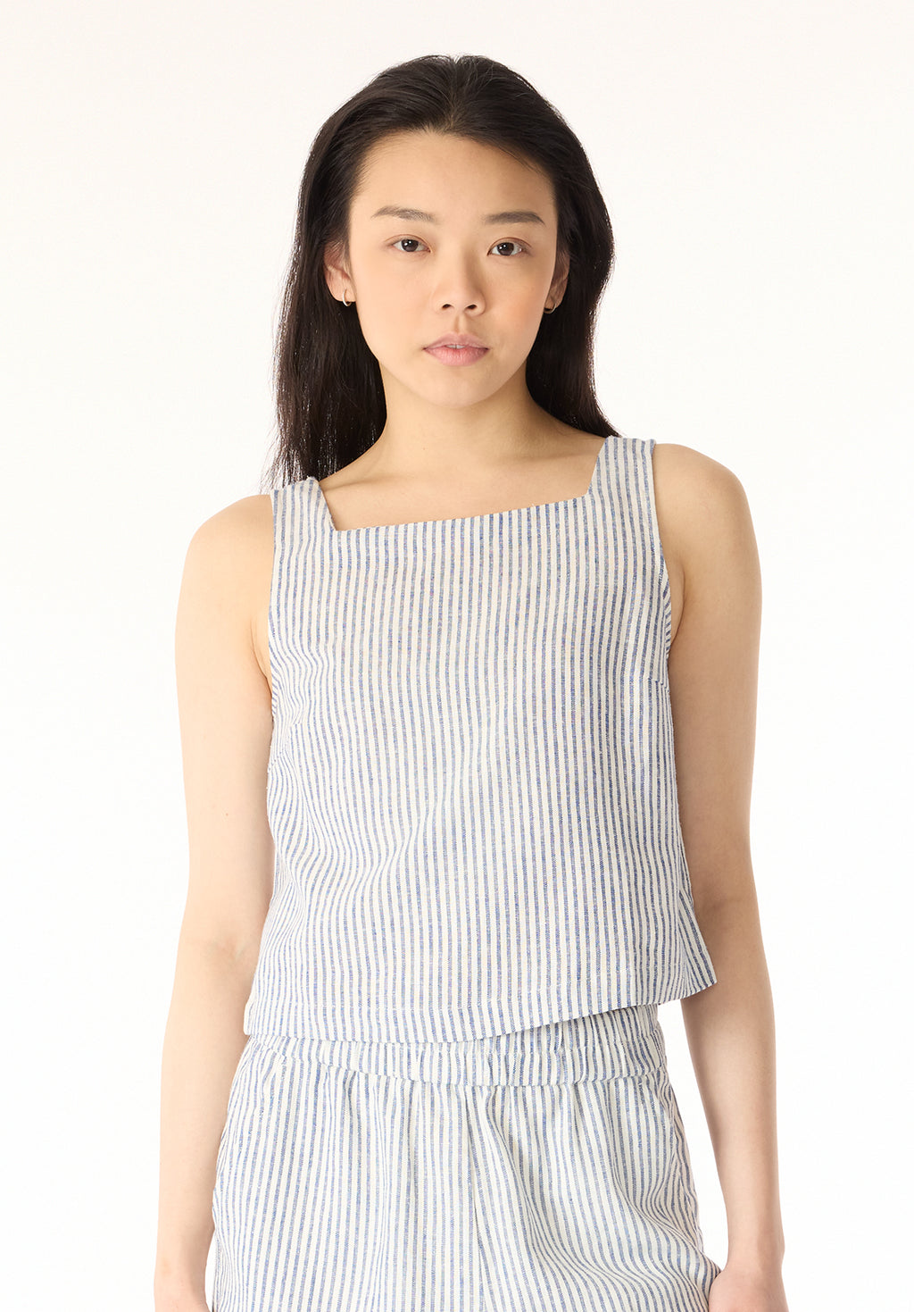Stay effortlessly stylish in this blue and white striped sleeveless top Benedita, crafted from breathable linen fabric for ultimate comfort. Featuring a square neckline and a relaxed fit, this versatile piece is perfect for warm-weather days. The lightweight material and timeless stripe pattern make it easy to pair with shorts, skirts, or wide-leg pants for a fresh and polished look. Ideal for casual outings or vacation wear, this top is a must-have for your summer wardrobe.