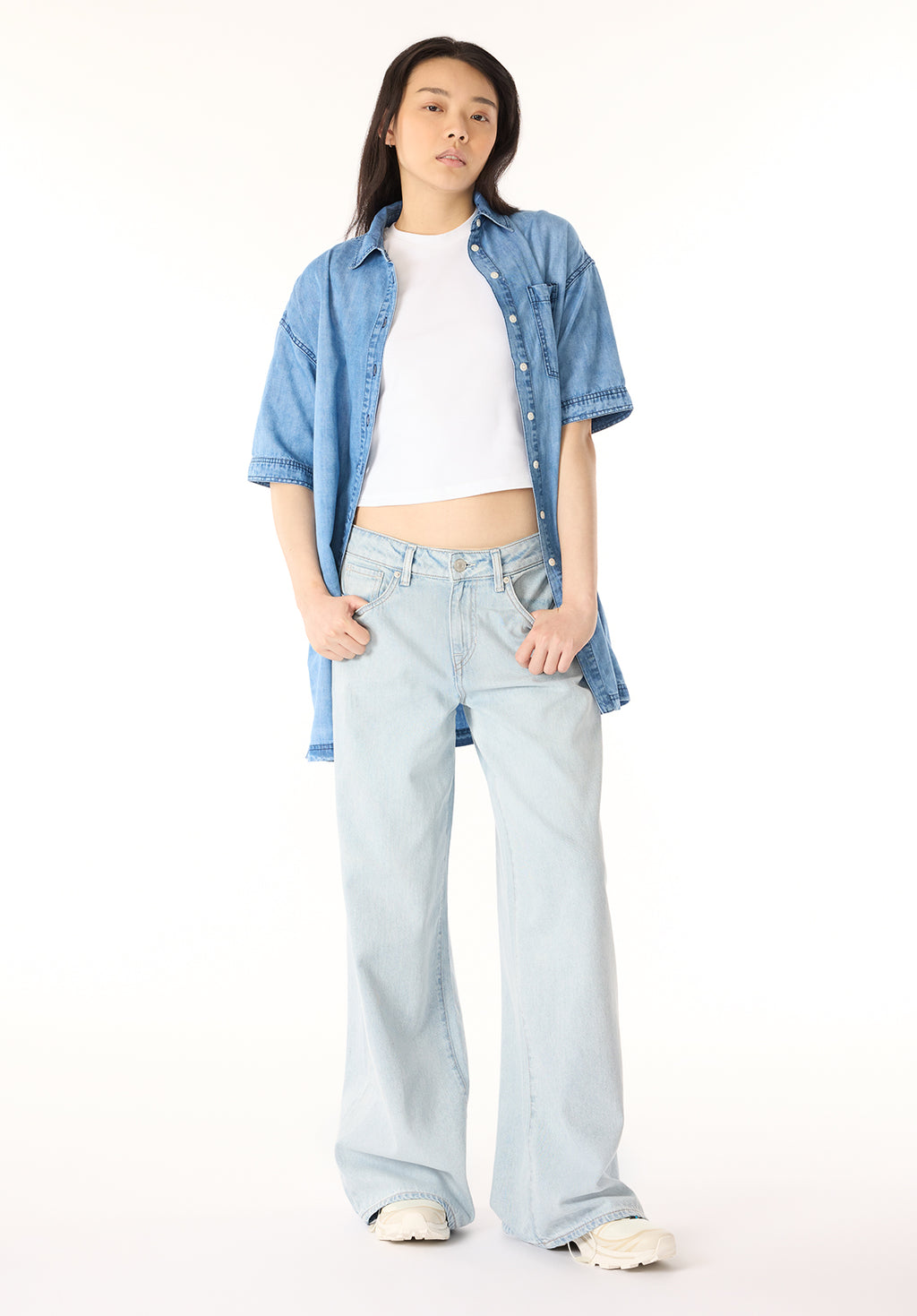 The Freida denim shirt dress offers a casual yet chic look perfect for everyday wear. This versatile piece is designed with a relaxed fit, button-down closure, and a classic shirt collar, giving it timeless appeal. Featuring rolled-up sleeves, a chest pocket, and convenient side pockets, this dress is both stylish and functional. The lightweight denim fabric ensures all-day comfort, while the above-the-knee length makes it perfect for warm weather or layering in cooler seasons.