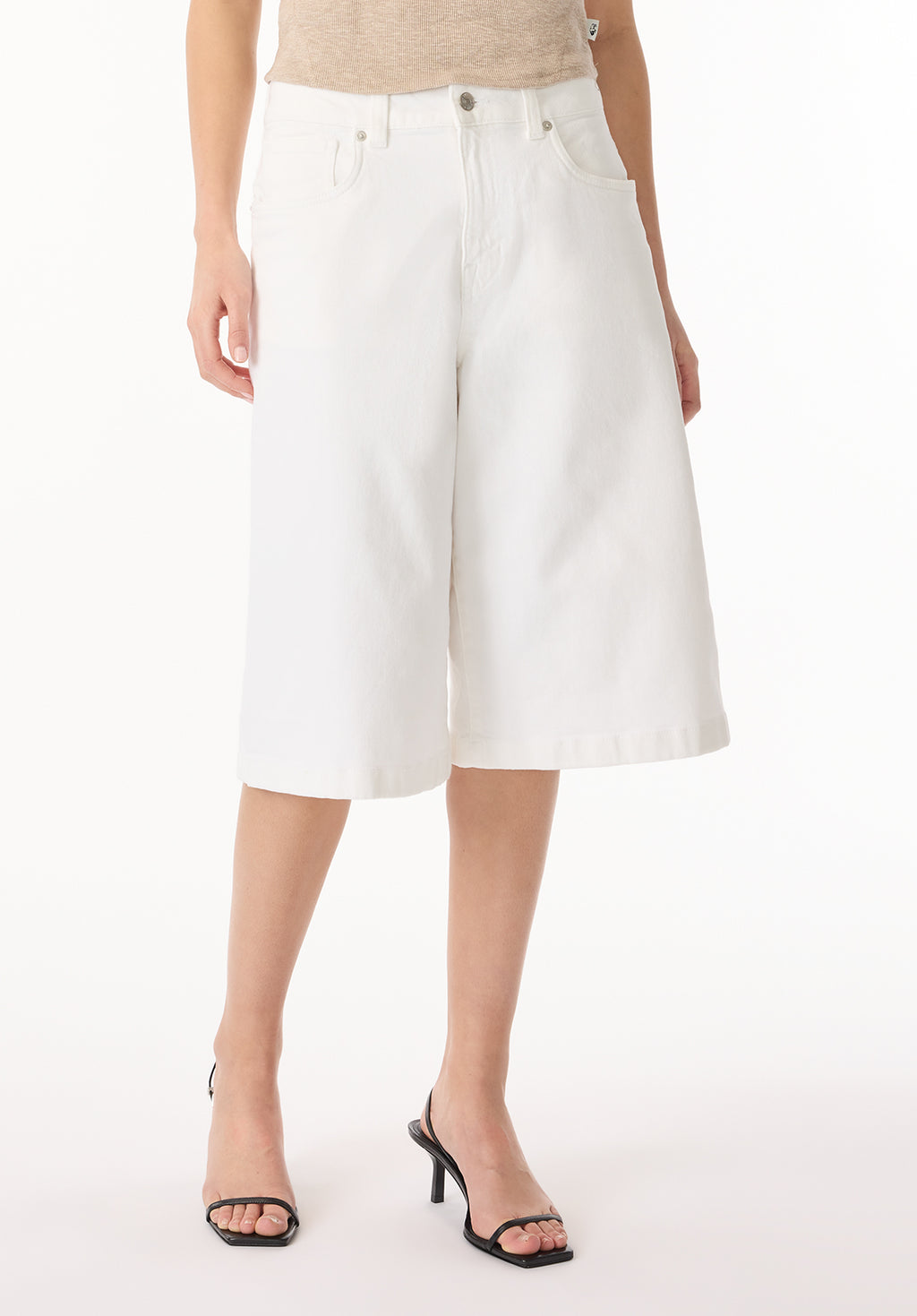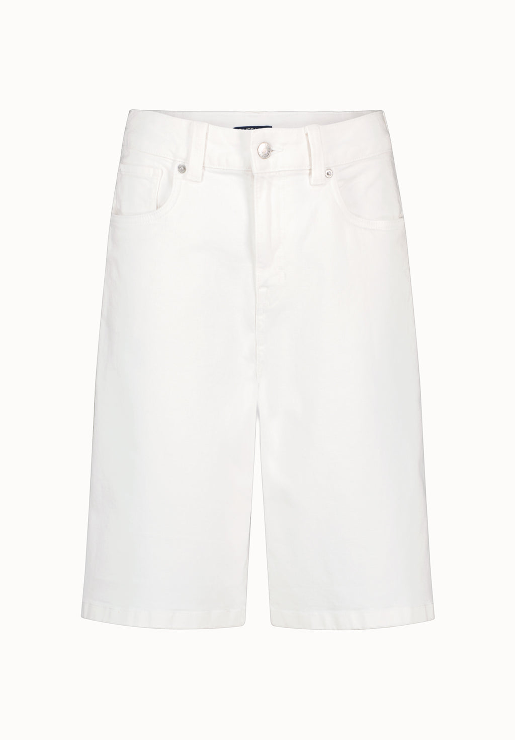 Stay effortlessly chic with these high-rise denim Jorts. Crafted from soft, durable fabric, these shorts feature a clean white finish for a fresh and modern look. The relaxed fit and knee-length cut provide a comfortable yet polished silhouette, making them perfect for warm-weather outings. Designed with classic 5-pocket styling and a versatile design, these shorts are a must-have for any casual wardrobe.