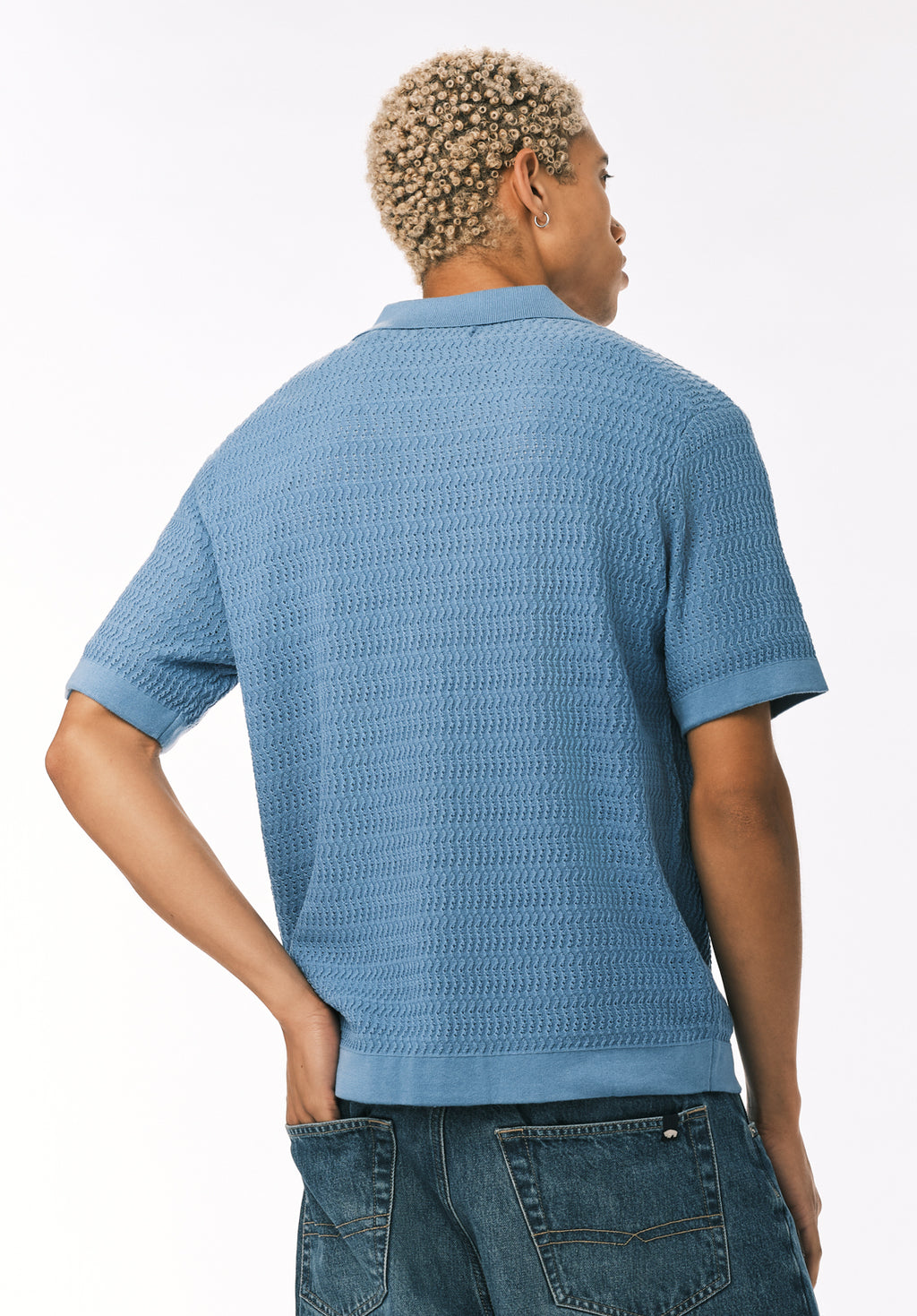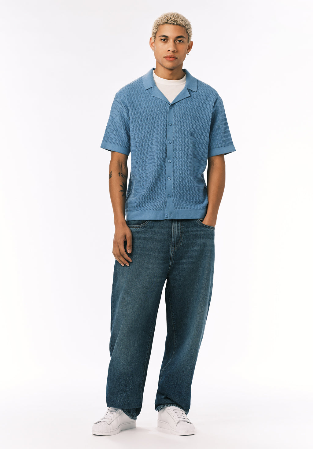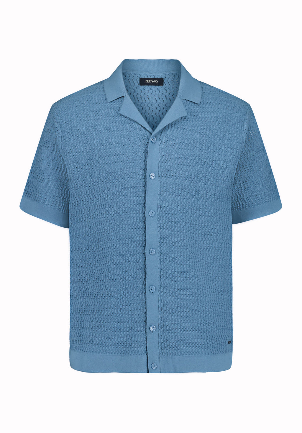 The Waldir men’s short sleeve knit button-up shirt features a textured knit pattern with a classic open collar and button-front closure. Finished with ribbed trim at the sleeves and hem, it offers an easy, polished look that pairs well with denim or casual trousers.